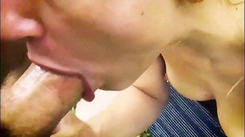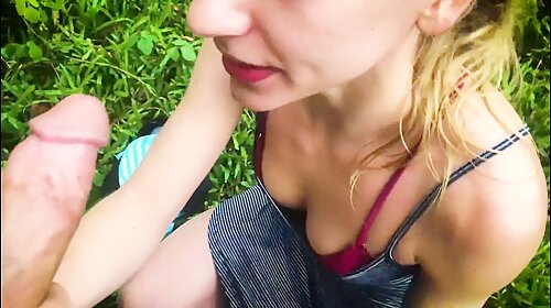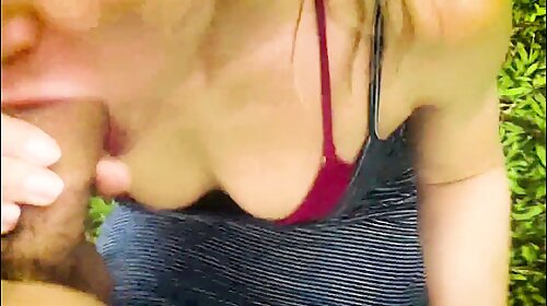 Sexy babe sucking thick dick in garden and want suck semen of client